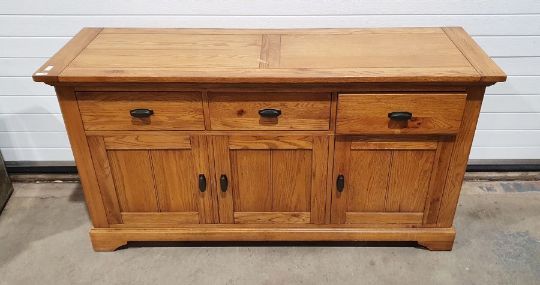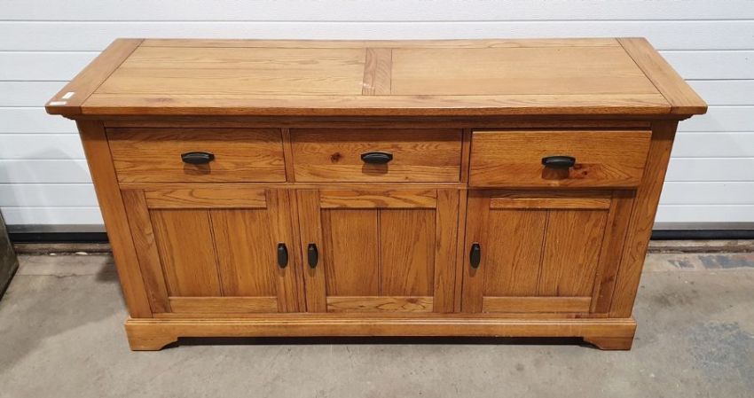 Modern oak sideboard wtih three drawers and three cupboard doors, on bracket feet, 160cm x 86cm