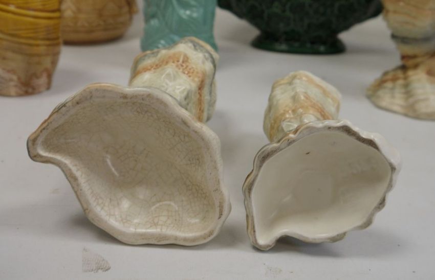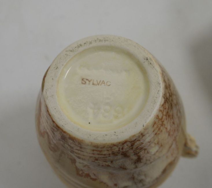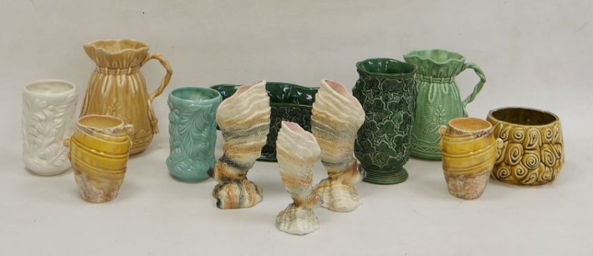 Collection of Sylvac vases, circa 1960 and later, impressed marks, including two sack-moulded jugs (20cm high), a tall cylindrical leaf-moulded green glazed vase, a footed two-handled jardiniere similar, three shell-moulded cornucopia vases and other items (12)