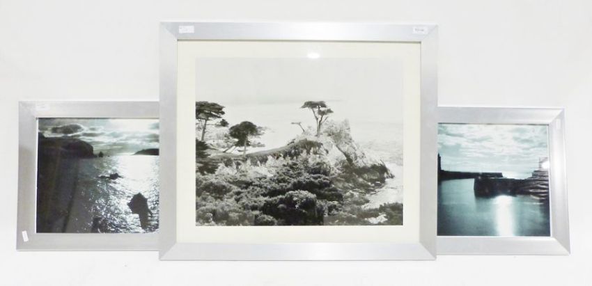 Two modern abstract prints of landscapes, indistinctly signed lower right together with three photographic prints (5)