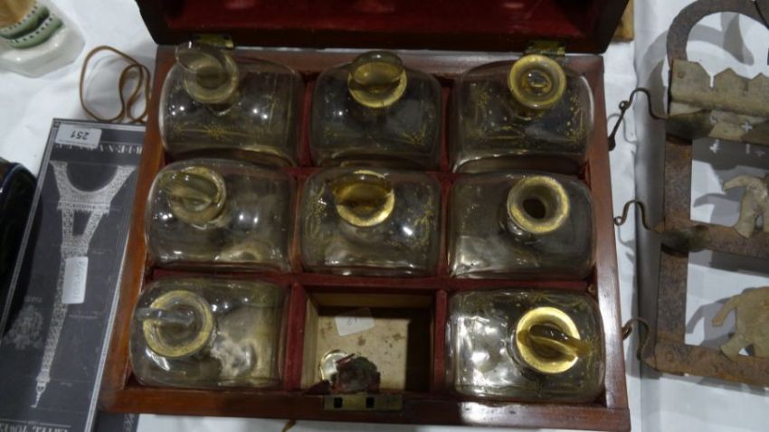 George III mahogany and inlaid decanter box, with divisions for nine decanters, retaining eight gilt decorated decanters and seven stoppersCondition ReportIn need of quite a bit of attention. See images. Lots of wear and tear - lost bottle, broken stopper, chips losses, split and losses to box. In need of attention.
