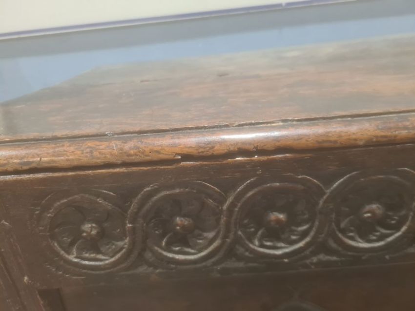 Possibly 17th century and later oak coffer, the rectangular top with moulded edge, diamond carved front panels, on style supports, 109cm wideCondition ReportHeight 61cmWidth 108cmDepth 51cmWear and scratches to top and sides. The feet are quite damaged. One of the back hinges is loose. The lock is damaged. The lid overhangs on one side more than the other. The are several small bits missing from the top. Please see attached images.