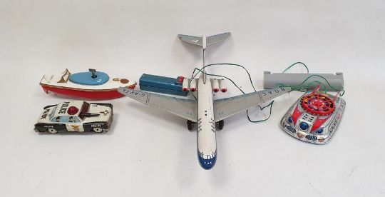 Collection of vintage toys including BOAC plane, battery operated police car and vintage hand built wind up model boat