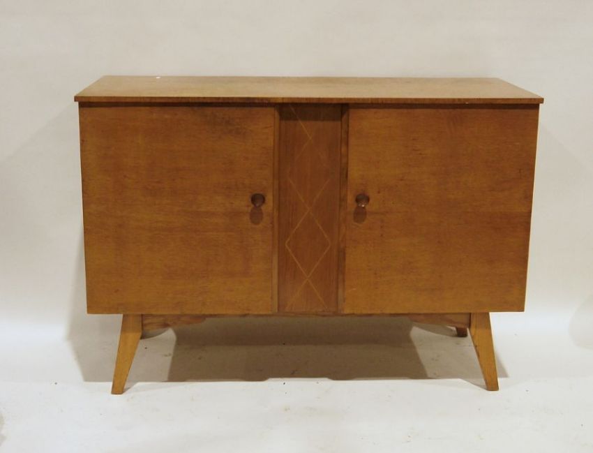 Mid-century modern Meredew oak sideboard with two cupboard doors, central panel with diamond motif, on tapering supports, 124cm x 87cm