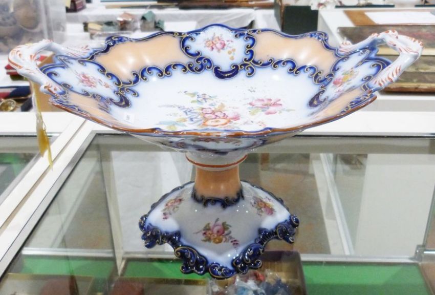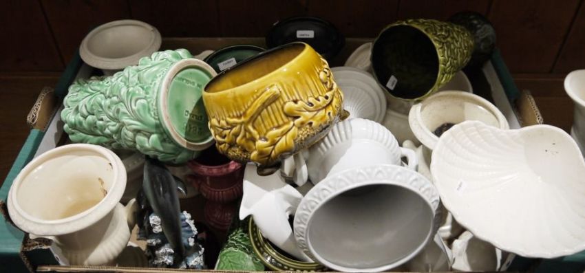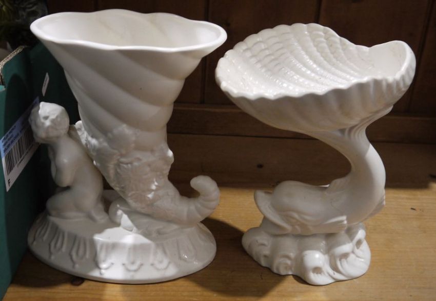 Collection of Dartmouth pottery vases and stands and other items, mid century, moulded marks, including a pair of white glazed dolphin tazzas (20.5cm high), campana vases in sizes, a pair of Poole pottery white glazed dolphins, various items of Sylvac, Victorian Staffordshire pottery two-handled rocaille moulded comport printed and painted with flowers and a Victorian footed tazza.