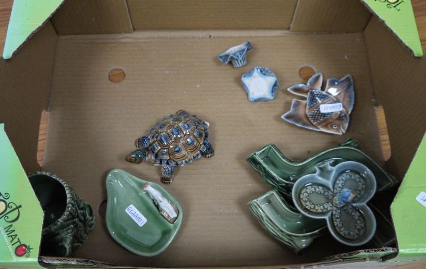 Large collection of Wade porcelain and other ceramic items, including a pair of dragon boat brown glazed small vases, a pair of posy vases, various squirrel moulded planters, assorted tortoise boxes and covers, a fish-shaped small dish, several trinket dishes applied with cats and dogs, two spoon rests applied with dogs, a Carlton Ware Art Deco jug moulded with bricks and painted with flowers and two metal dishes decorated with ceramic shards