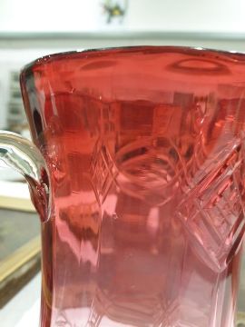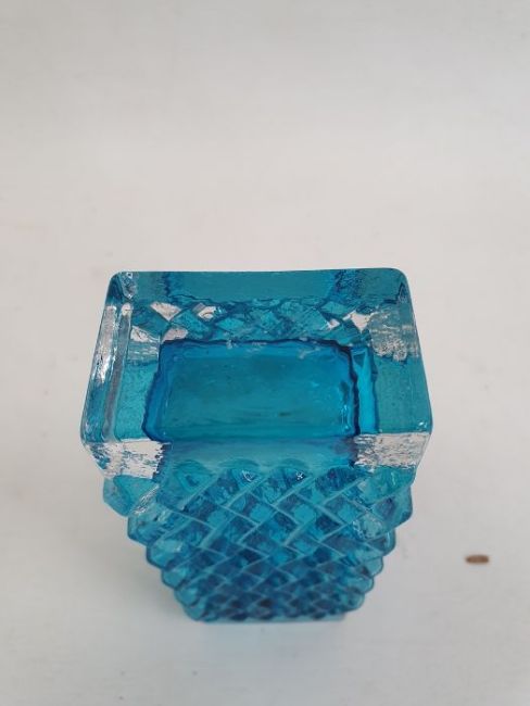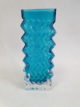 Nailsea glass rolling pin decorated in blue and brown spots, 39.5cm long, a Whitefriars kingfisher blue Zig-Zag vase designed by Geoffrey Baxter, 15.5cm high, a collection of paperweights and other glassware, a Royal Brierley art glass red lustred vase, eight assorted paperweights including a Caithness paperweight 'Wise Owl', another moulded as a blue tinted bird, a mug with trailed decoration, an Atlantis Portuguese crystal square-section spirit decanter and stopper and other items Condition ReportZig Zag vase appears in good order, no obvious signs of damage. General wear and tear.Condition report request on jugs and vases:Red lustre vase- Several small chips/imperfections. Light scratches and marks.Cut glass vases- Light surface marks and scratches. Base wear.Cranberry fade jug- Some air bubbles/imperfections. Base wear and some marking.See pictures.