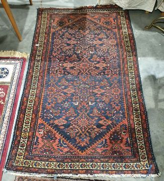 Persian rug, blue ground field with red ground decoration, stepped border, 192cm x 113cm