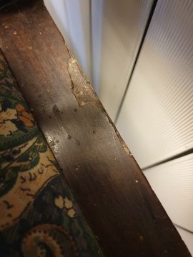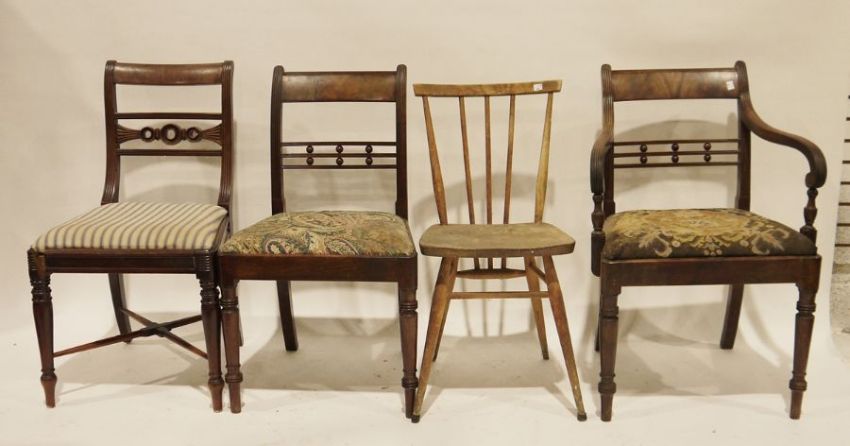 Ercol stickback chair and three further chairs (4) Condition ReportErcol Stick back- Heavy surface wear including chips, scratches and mark throughout. Seems structurally sound.Carver- Wear and rips to needlework, some chips and scratches. Crack to right arm.Striped upholstered chair - Discolouration to fabric. Wear throughout, loss to front left joint, large chip to back decor.Other - Wear throughout, patches of veneer loss to back of seat. Old woodworm holes.