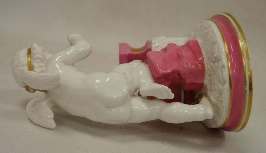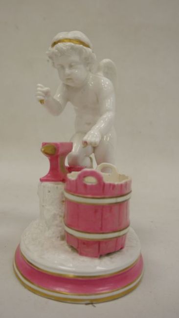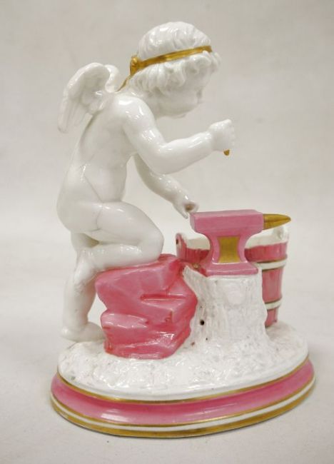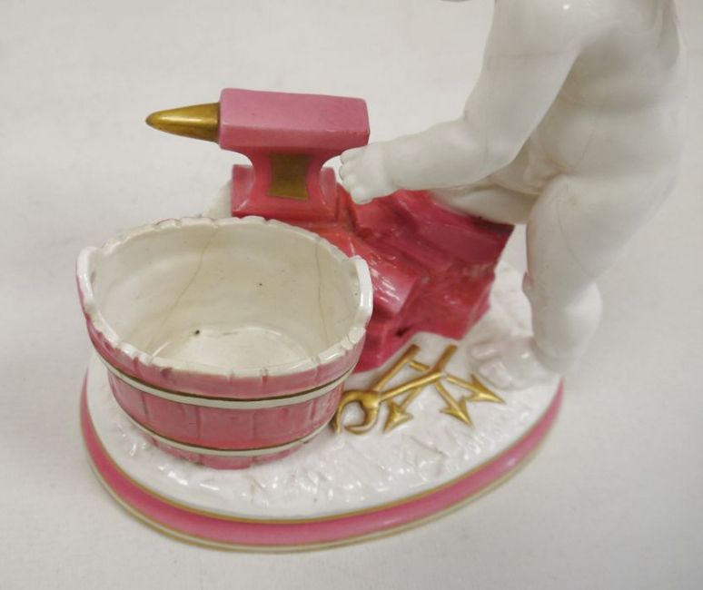 Brownfield porcelain model of a cupid at his forge, circa 1870, impressed marks, cupid modelled before a barrel with an anvil and arrows at his feet, enriched in pink and gilding, 21cm high