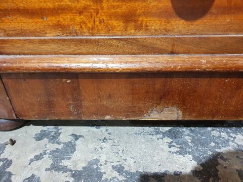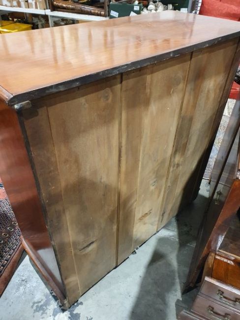 19th century Scottish mahogany chest, the rectangular top with rounded front corners and moulded edge, above two short drawers flanking central bonnet drawer, above three long drawers, on plinth base, 117cm x 119cmCondition ReportSurface scratches, scuffs and knocks tothe wood. Fading and discolouration  in areas. Areas of loss to the veneer. Locks removed from drawers.