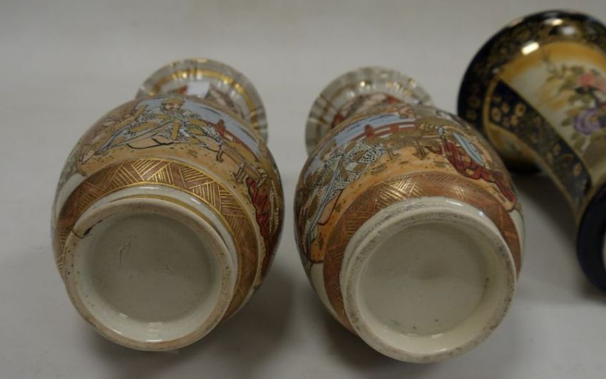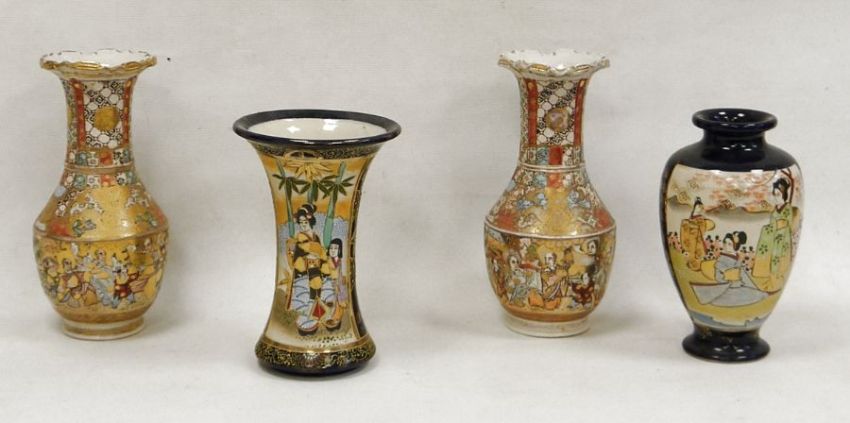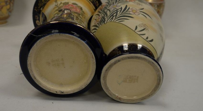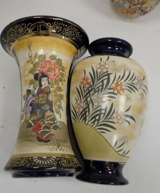 Collection of Japanese pottery vases, late 19th/early 20th century, printed marks, comprising a pair of Satsuma frill neck vases painted with panels of figures and brocading (26cm high), a blue ground oviform vase decorated with figures of ladies and flowers and another of waisted form, similarly decorated