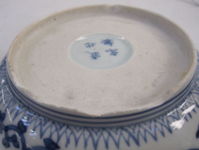 Set of three Chinese porcelain bowls, each slightly lobed and with ogee moulded border, painted in blue with panels of prunus and pine, four-character mark to base, 15cm diameter Condition ReportPlease see additional imagesAll three base rims are chipped, (one a large area), some pinholes, no visible cracks