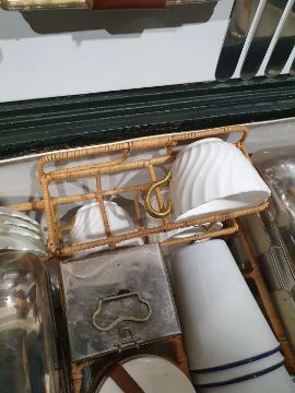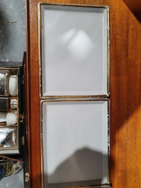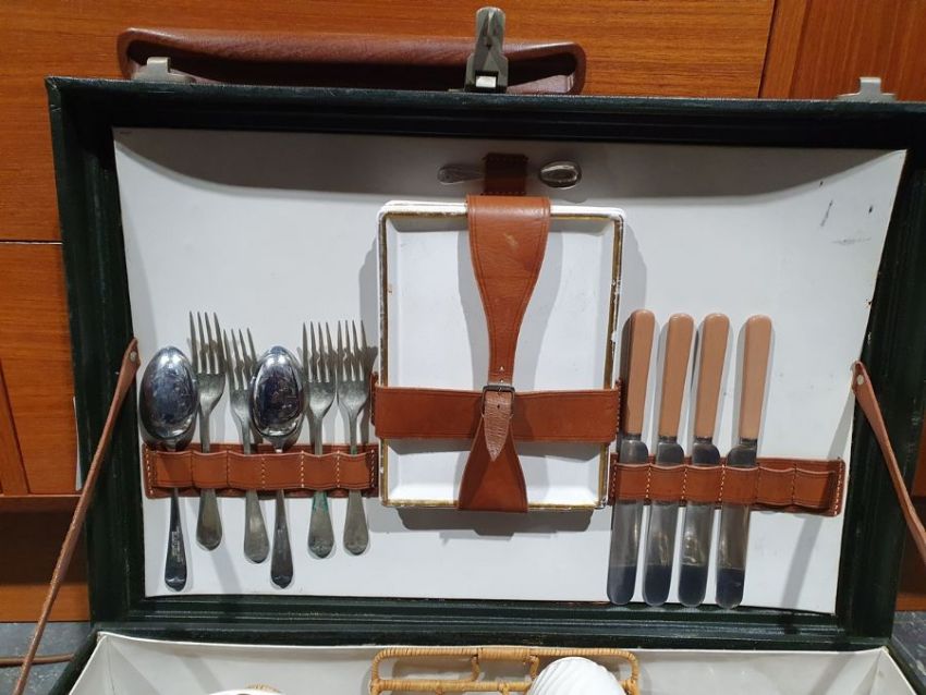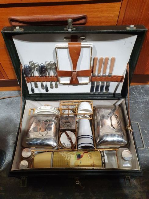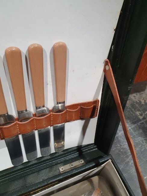 Items have surface scratches, accretions and wear. Two knives missing, probably not the original flask, tea cup missing, one of the tins has been replaced. Clouding to the glass bottles.