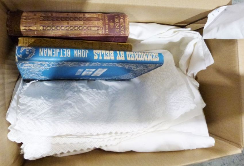 Royal Doulton "Pillar Rose" part dinner/tea service, a Spectrum wall clock, two embossed brass trays together with various china, glassware and linen (3 boxes)