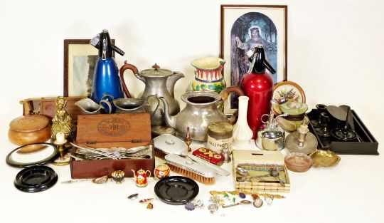 Two vintage soda syphons, a hammered pewter tea service, silver-plate teaspoons, framed photographs one dated 1936 of a school gym club, costume jewellery, music score, pamphlets, etc (2 boxes)