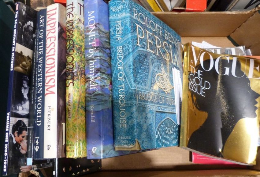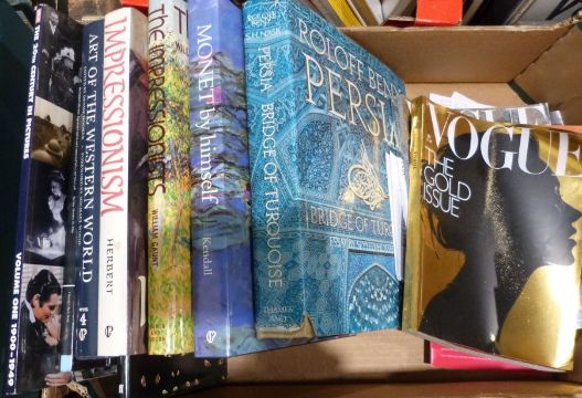 Various books on art and two vintage Vogue magazines, the gold issue and the silver 2000 millennium issue (3 boxes)