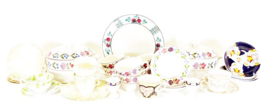 Adams 'Old Colonial' china to include six cups, two saucers, two casserole dishes and a platter, Waitrose square seven side plates and eight dinner plates and assorted late 19th/early 20th century china (2 boxes)