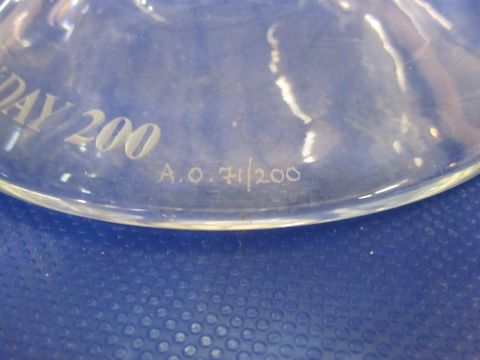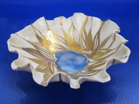 Susan Buchner studio porcelain dish with gold and blue detailing (5cm tall), glass bowl engraved with pictures of jockeys and horses with ‘Derby Day 200' on base marked 'a.o.71/200’ (16cm tall x 19cm wide) (2)