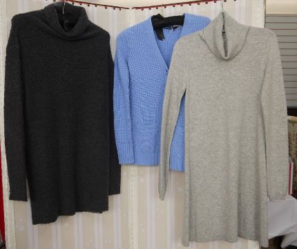 An Alpaca woollen poncho with tie front, matching scarf, fur trim and an appliqued alpaca onto the scarf, a blue Alessio Bardelle boucle wool tunic, a Jaeger camel short-sleeved cardigan with cowl neck and large black button fastening, a polo-neck camel woollen jumper by Malene Birger, a Birger and Mikkelsen grey jumper with a deep cowl neck and three-quarter length sleeves and a Max Mara Weekend wool waistcoat, a Max Mara black jumper with bobble detail to the hem, a Moss Copenhagen woollen polo-neck jumper, a Ralph Lauren blue cotton cardigan and a White Company cashmere polo tunic (10)