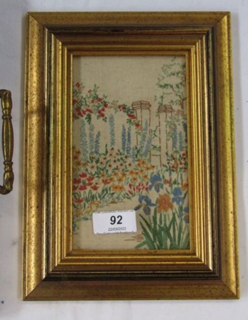 Early 20th century two two-handled trays inset with embroidery under glass, and embroidered picture of a garden and a print on silk depicting butterflies (4)