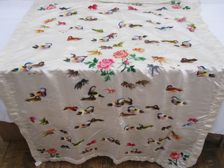 Chinese embroidered silk cloth depicting various types of duck, with peonies in the central design and goldfish, 153cm x 103cm