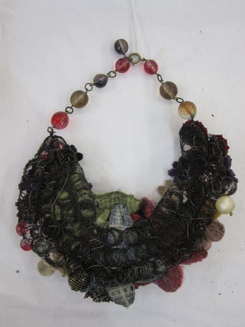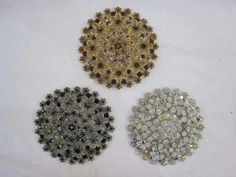 Three large Butler & Wilson circular floral diamante brooches, one in shades of white, one in shades of gold and brown and one in shades of white and black and Butler & Wilson floral collar, having felt and beaded relief flowerheads, in pink Butler & Wilson box (4)