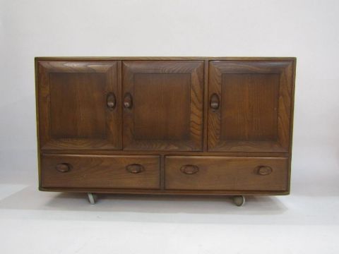 Ercol elm sideboard with oval dished handles, 3 cupboard doors above 2 drawers on casters (129cm wide x 76cm tall x 43cm deep)