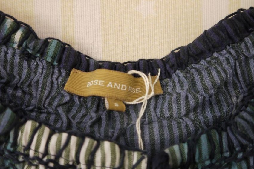 Cotton blue and caramel coloured shirt with short sleeves, labelled Joseph, a Pure Collection cotton pale blue and white strip, a Rose & Rose peasant style mini dress/tunic striped and embroidered with applique flowers, elasticated neck and lace insert to the hem, a dark blue Shirt Company shirt with pussy bow tie front, a black animal print Calvin Klein shirt with pin-tucked detail to the bodice, a Max Mara Weekend blouse, pink printed front with a plain back, an A.R.T. sleeveless blouse, waistcoat style, side fastening, a Denim shirt be Nexx (8)