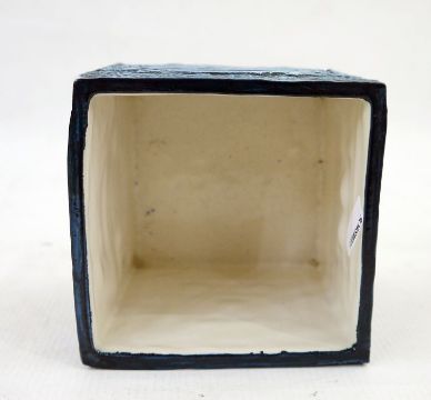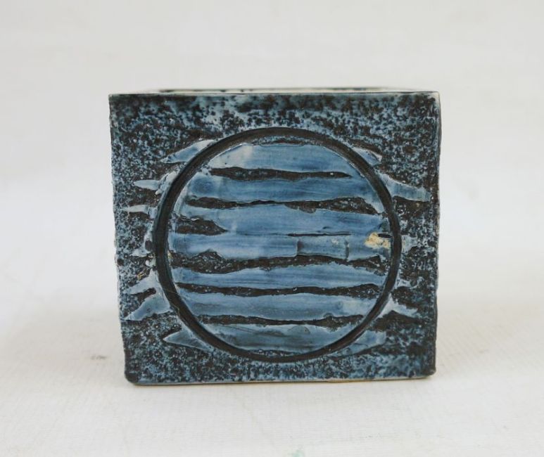 A Blue Troika pottery cube vase Avril Bennet with incised geometric decoration, inscribed 'Troika AB’ (8cm tall)