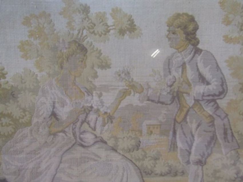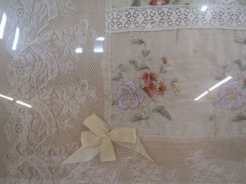 Souvenir embroidered and lace handkerchief  WWI  ' Souvenir D'Arras' depicting the cathedral in flames in the central cartouche, framed  74 x 71 cms with D Hawksley ( 210th century)Paint over print  , Mother with an infant in a meadow amongst lambs 72.5 x 48 cms and another print (3)