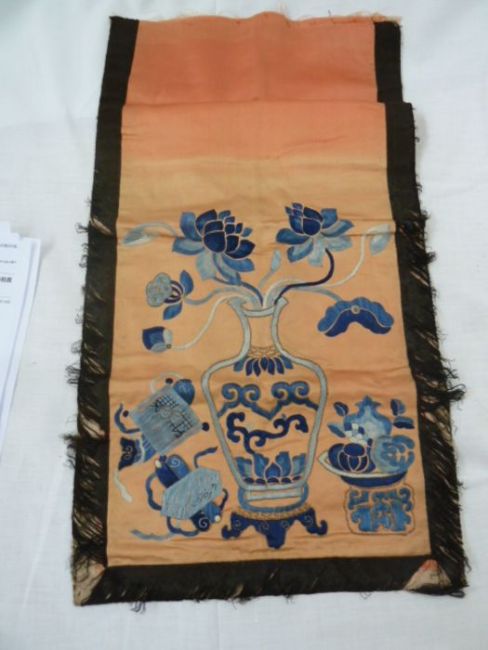 Chinese embroidered silk panel, orange ground with Peking knot floral embroidery, black borders, unframed, 82cm x 32cm and two other Chinese silk part panels, peach ground with blue embroidered vase with black border, the other blue ground and floral decorated (3)  the peach ground measures 24 x 30 cms and the small blue ground measures 17x x 30Condition Reportthe peach ground measures 24 x 30 cms and the small blue ground measures 17x x 30