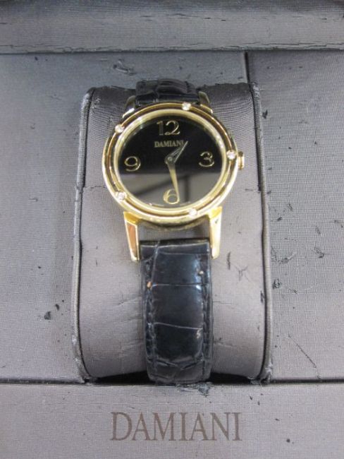 Damiani 18ct gold watch with 5 diamonds outside rim with black face in original box, the face measures 2.25 cms and 2.00 cms within the frame