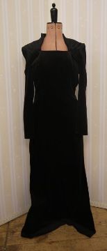 Frank Usher black taffeta sunray pleated wrapover skirt, full length with a matching sash and a black velvet full-length evening gown with long sleeves, square neck and stand-up collar