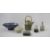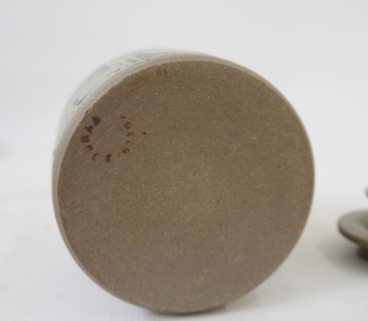 Green glazed vase with ‘S’ mark to lower rim (14cm tall), square based blue vase with Cornwall studio pottery mark to base (10cm tall), studio pottery ceramic teapot with bamboo handle in the style of Wayne Brannum (25cm tall), bowl with pierced lid (8cm tall x 11 wide), green enamel box with wood interior (9cm x 9cm) and large blue decorative dish with blue rim and floral detail. (26 wide x 9 tall) (6)