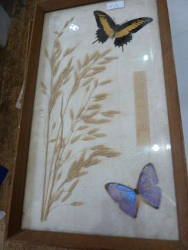 Pair of framed butterfly displays to include an Anise Swallowtail, a Menelaus Morpho, a Menelaus Blue Morpho and a Juno Silver Spot, with Oriental characters and dried grasses ( 2)44 x 24 cms framed