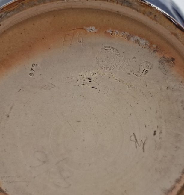 Royal Doulton stoneware jardiniere, shouldered and slightly tapering body, foliate branch decorated to a blue ground, 18cm high and another with Art Nouveau floral and part shaped trailing border, to blue/green ground, 18.5cm high approx. (2) Condition ReportThe Art Nouveau pot has a firing crack to the base, small firing cracks to the border, small chips to the base.Both pots have surface scratches, accretions, and general wear and tear. No obvious signs of repairs.