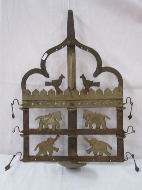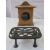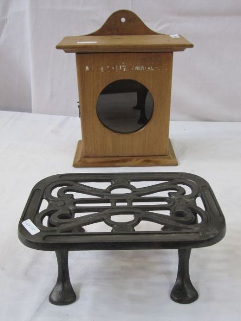 20th century metal wall bird feeder decorated with elephants, birds and horse silhouettes. 57 x 37. circular glazed cupboard (possibly clock box) 24cm x 12cm x 24cm. and 19th century cast iron trivet on legs. 24cm x 14cm x 10cm