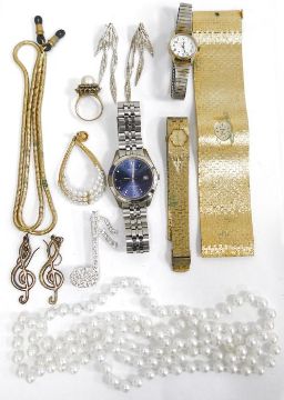 Assorted beaded necklaces and watches as well as gold-coloured mesh/chainlink neckerchief (1 box)