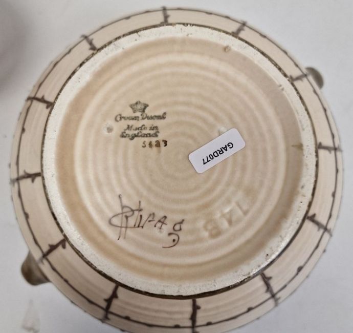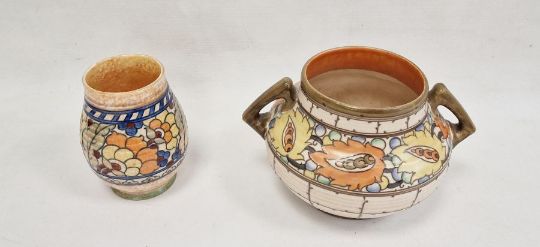 Charlotte Rhead Crown Ducal vase, shouldered with angular handles, tubeline decorated with yellow and orange foliate border, 15cm high and Charlotte Rhead vase, baluster-shaped, tubeline decorated with band of stylised flowers and foliage to an orange ground, 14cm high, both signed to base (2)