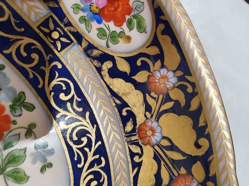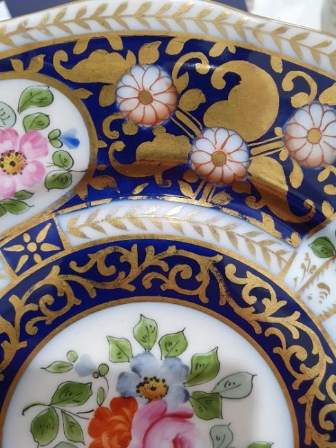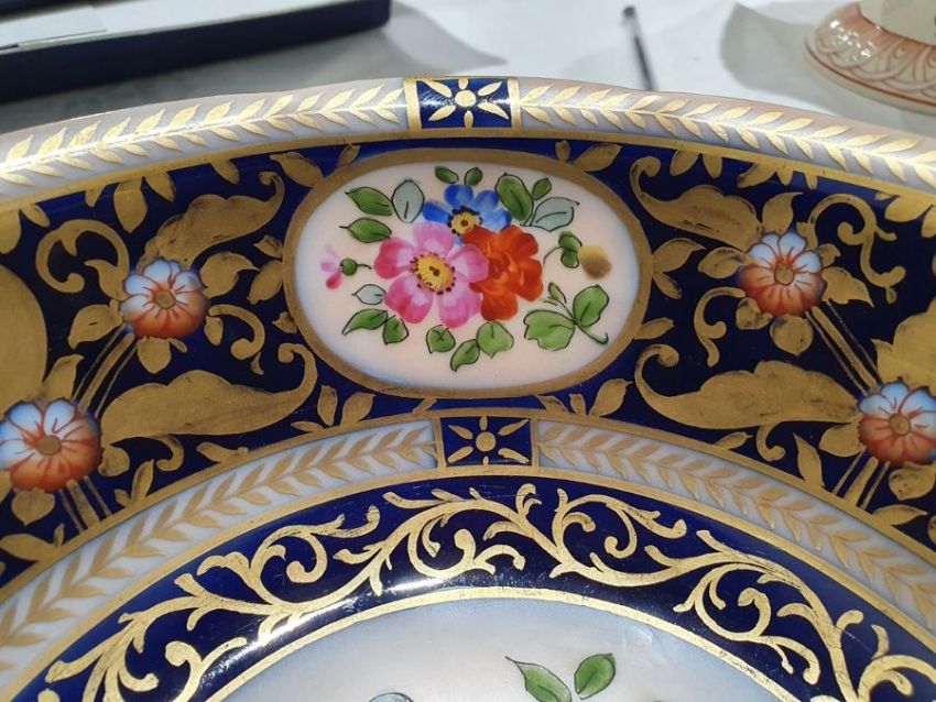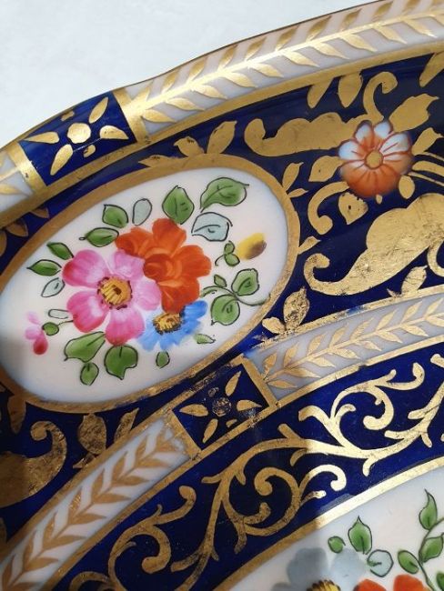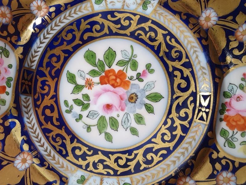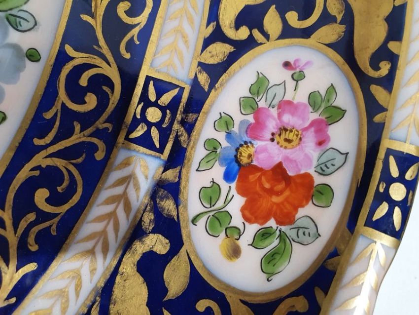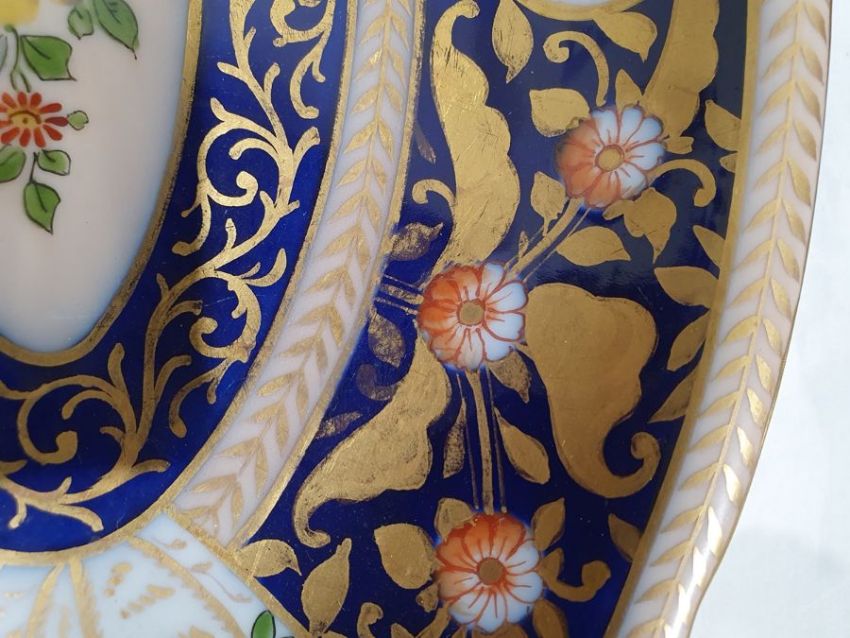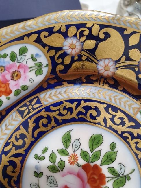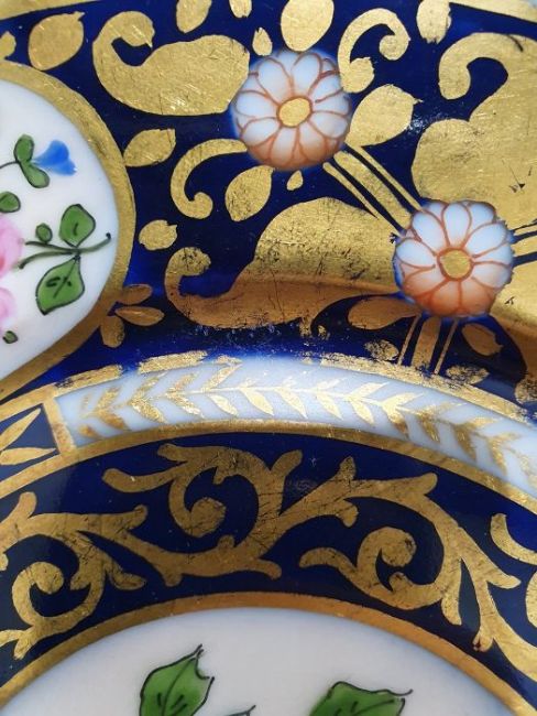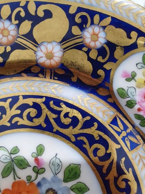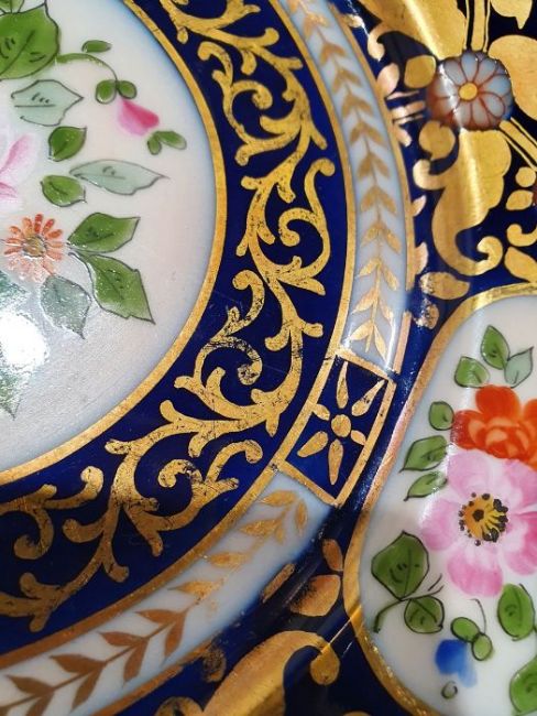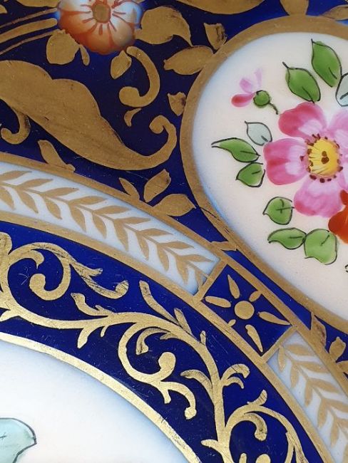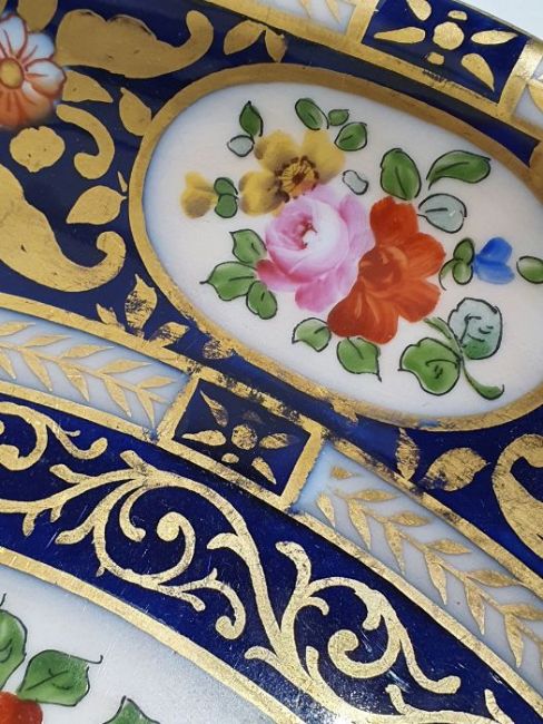 Continental porcelain dessert service for eight persons, two elliptical dishes,circular serving dish, allover floral painted in reserves to royal blue and gilt ground Condition ReportAll pieces with surface scratches, accretions, wear to the gilt and parts of the decoration.  See photos.
