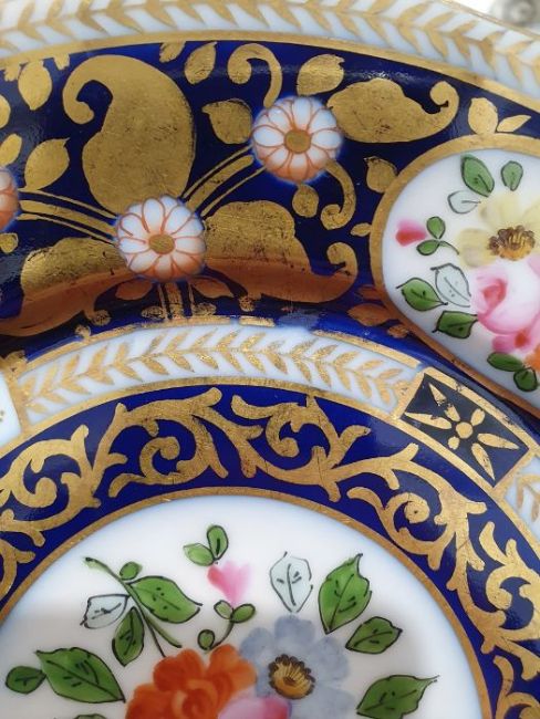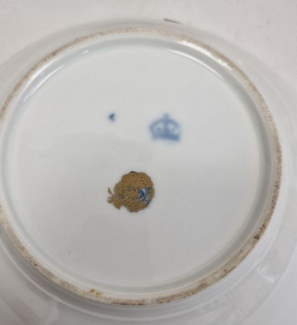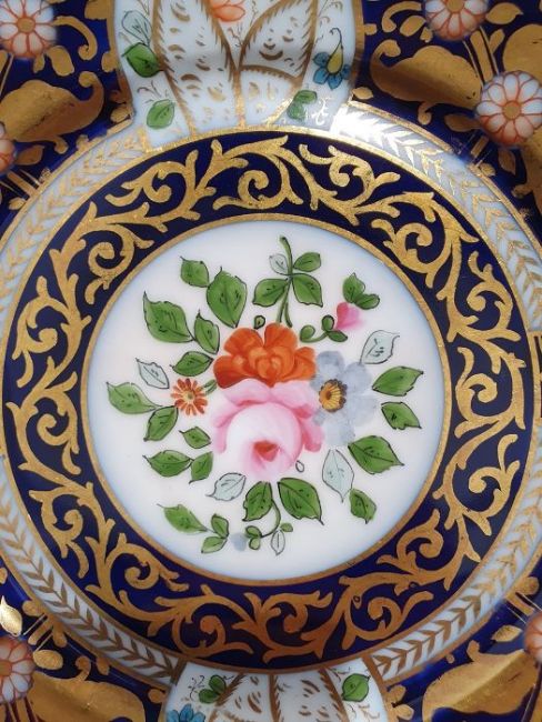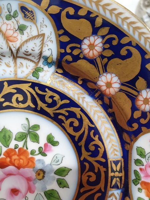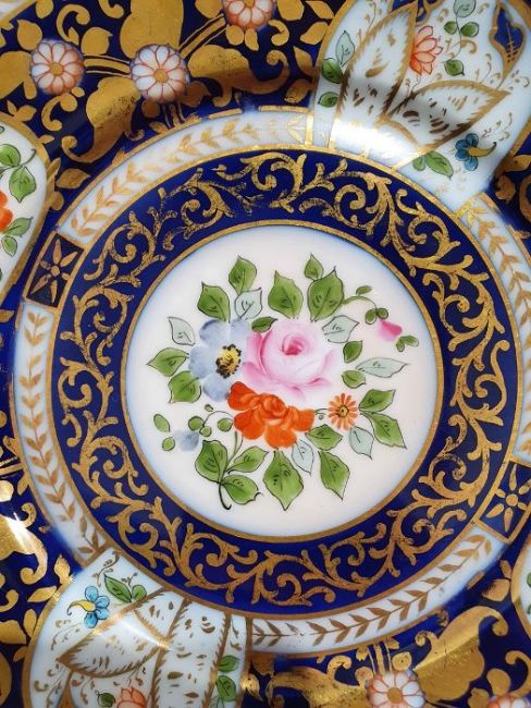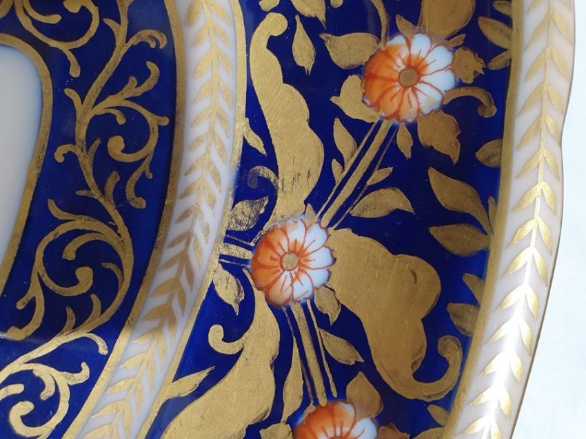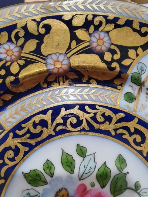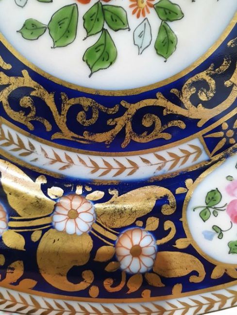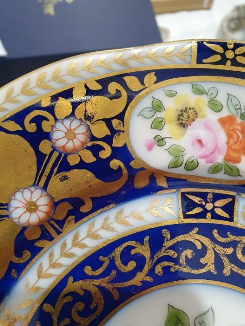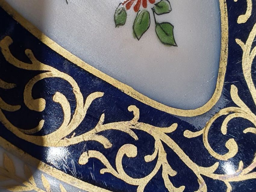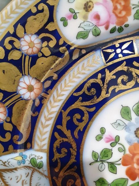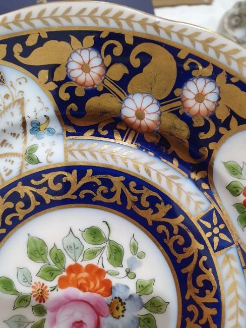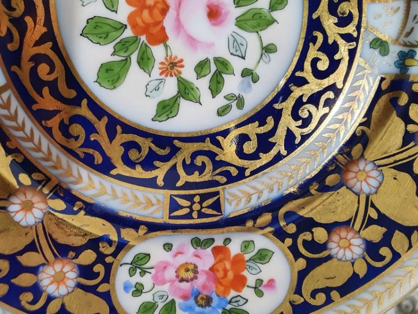 Continental porcelain dessert service for eight persons, two elliptical dishes,circular serving dish, allover floral painted in reserves to royal blue and gilt ground Condition ReportAll pieces with surface scratches, accretions, wear to the gilt and parts of the decoration.  See photos.