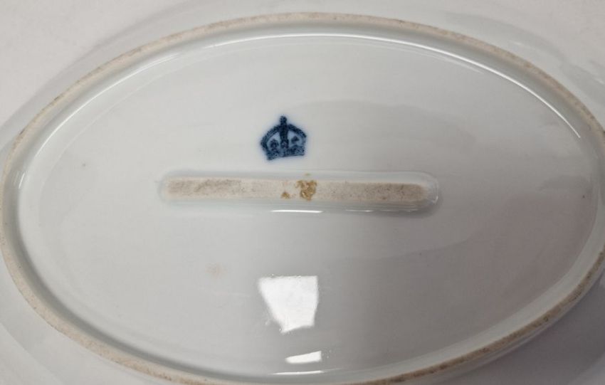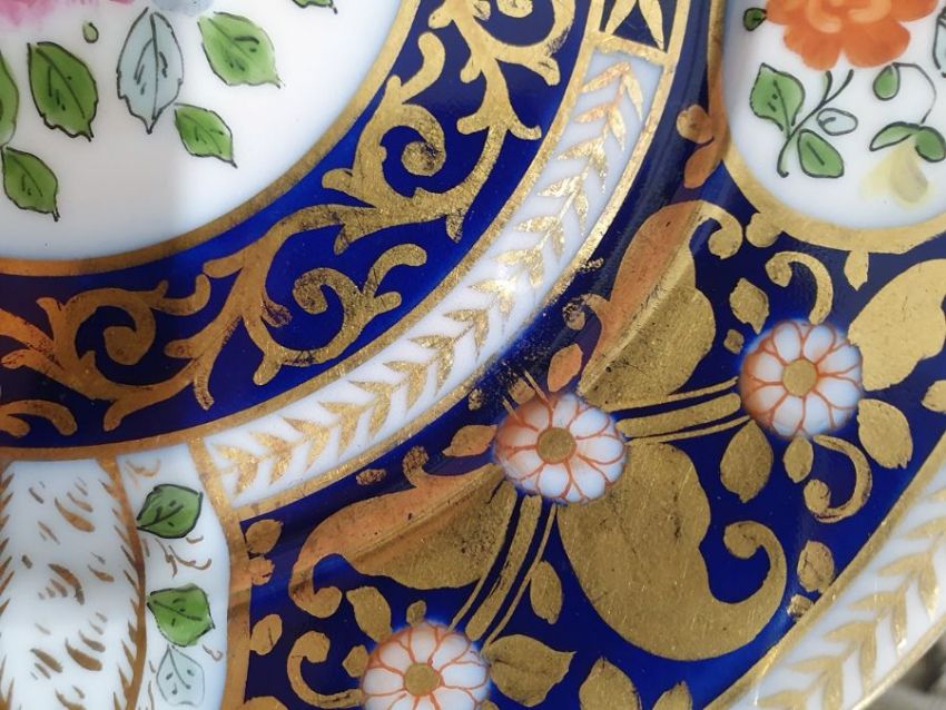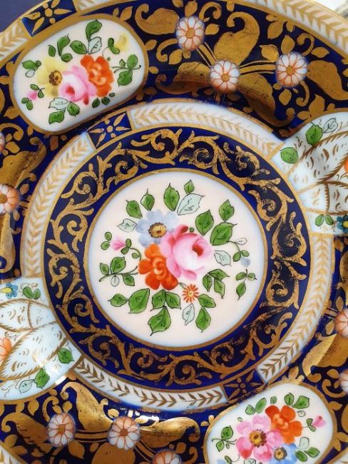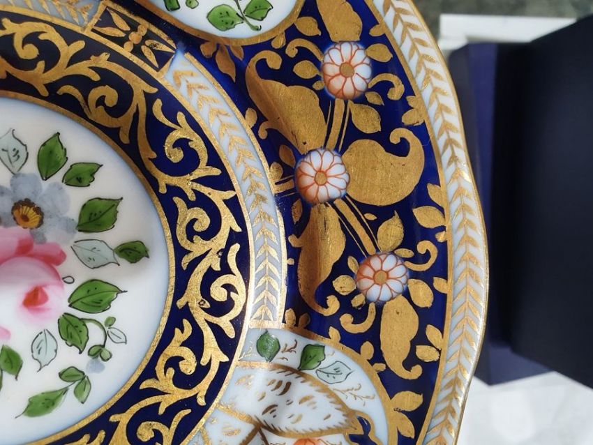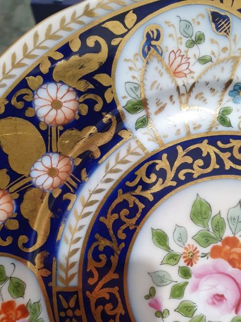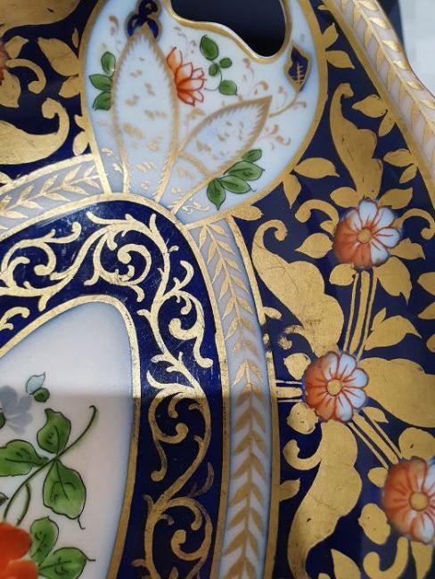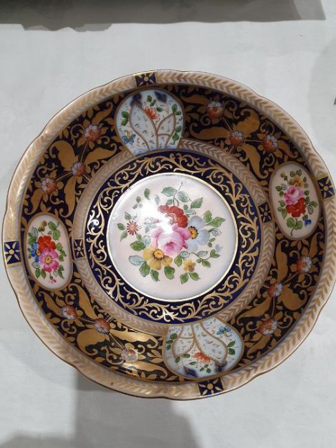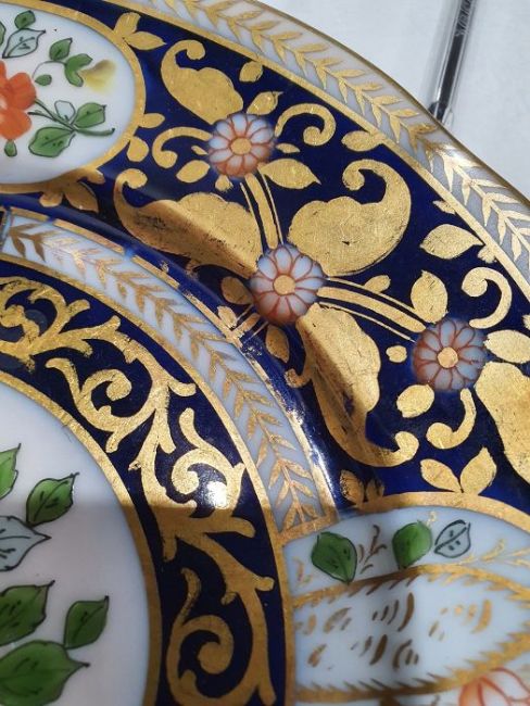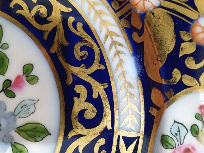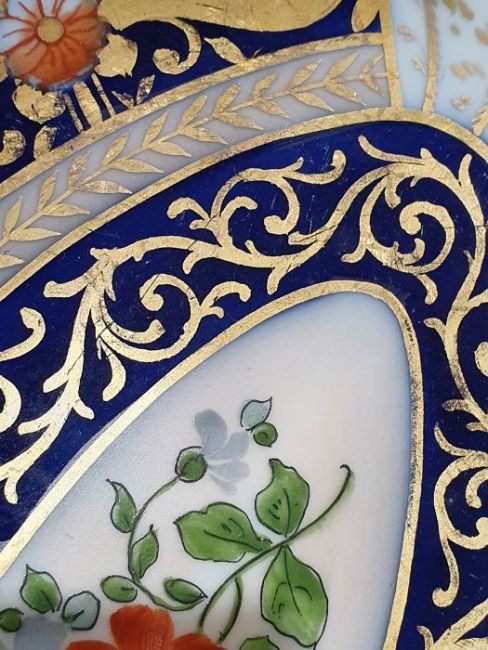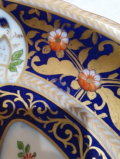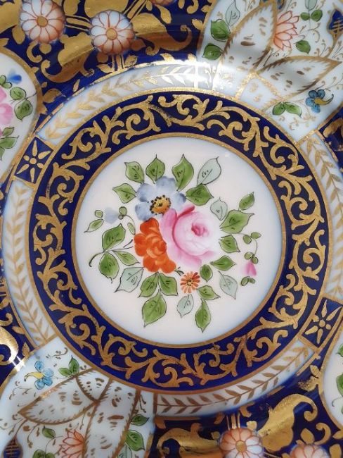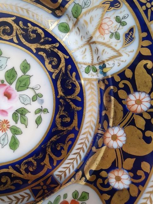 Continental porcelain dessert service for eight persons, two elliptical dishes,circular serving dish, allover floral painted in reserves to royal blue and gilt ground Condition ReportAll pieces with surface scratches, accretions, wear to the gilt and parts of the decoration.  See photos.