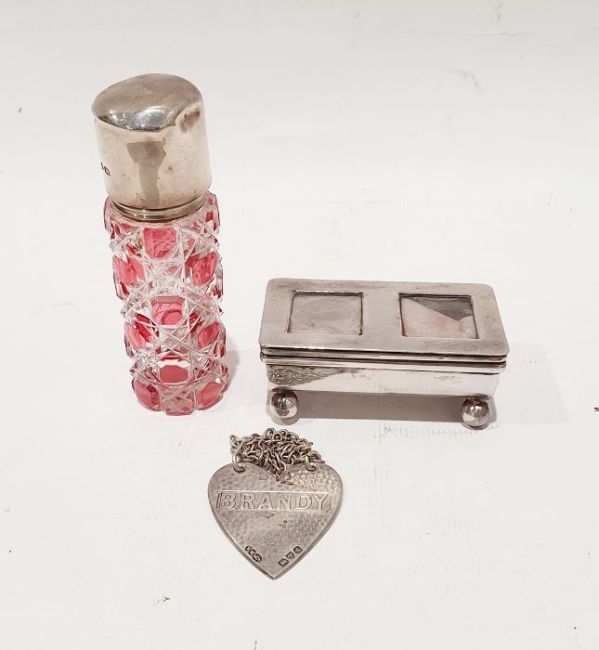 Silver postage stamp holder with two glass inset panels to the hinged lid, on a barrel-shaped body, to four ball feet, a stylised heart-shaped silver bottle with tag marked 'Brandy' and a silver-topped cut glass bottle (3)