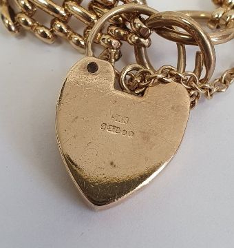 9ct gold flexible gate-pattern bracelet and having heart-shaped padlock, 375 mark, approx. 24.5g