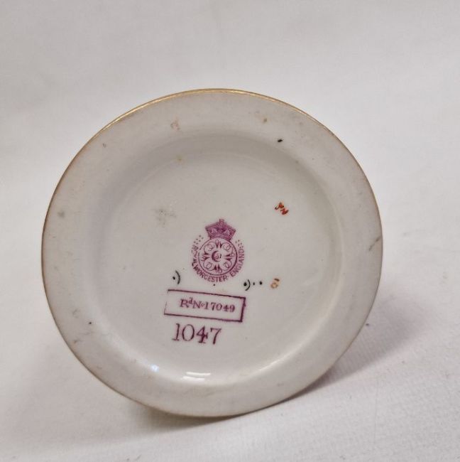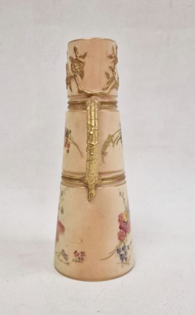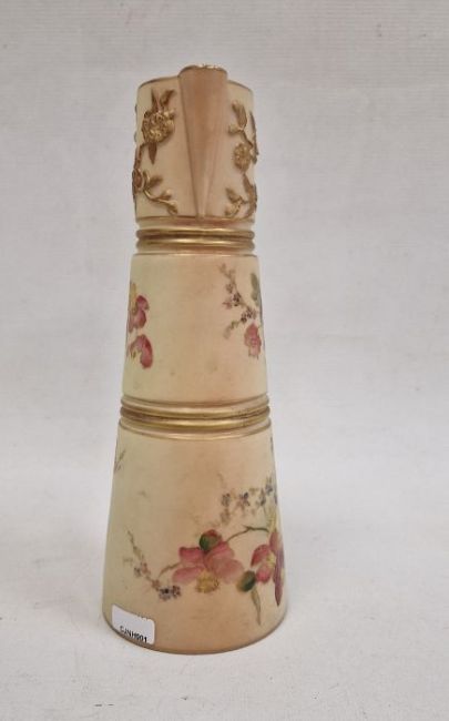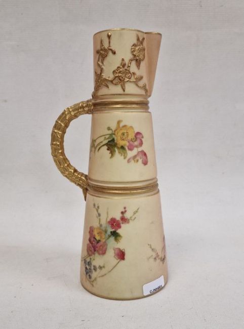 Edwardian Worcester blush porcelain jug, tapered with gilt prunus decoration and branch handle, floral spray painted, model no.1047, date mark 1904, 22.5cm high