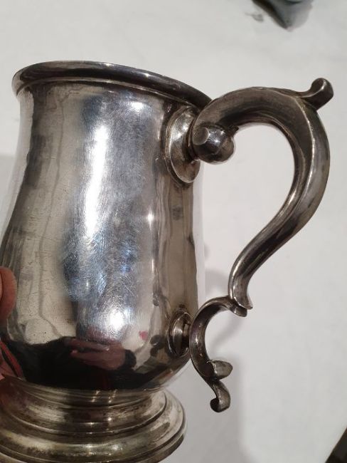 George III silver baluster-shaped mug on circular foot, scrolled handle, London 1767 by Thomas Wallis, 10ozt Condition ReportLight surface scratches. A couple of very small dents which are hard to capture with the camera.  No engravings or erasures. Handle is straight.Height approx. 12.5cm