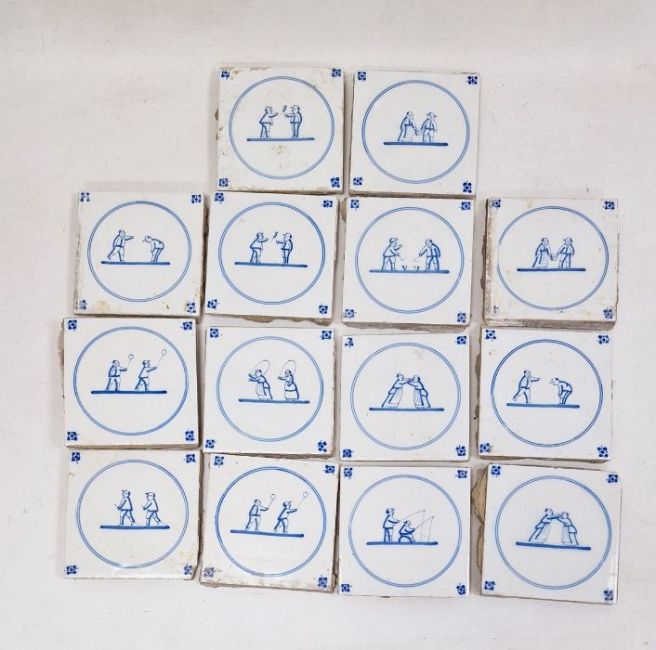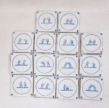 14 blue and white delft tiles, each of two figures, within circle to include wrestling and fishing (14) Condition ReportPhotos added13 x 13cm