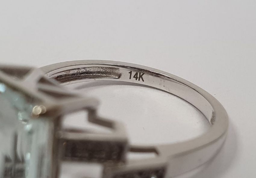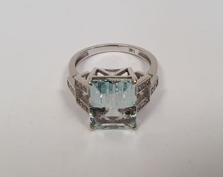 14K gold, aquamarine and diamond ring set central rectangular cut pastel blue aquamarine, approx. 4ct and having angular open shoulders set with small diamondsCondition ReportAquamarine stone size:Length approx. 1.2cmWidth approx. 0.8 cmDepth approx. 0.5cmRing size O