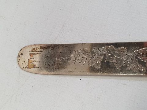 Victorian silver knife and fork set in mahogany canteen, the handles with embossed grape and vine decoration and similar engraved decoration to the blades, Sheffield, Roberts & Slater, 1847Condition ReportSurface scratches and scuffs. Small dents to handles. Some tarnishing to blades and forks, accretions and polish residue present. Hinges of case are sound. Total weight of knives - 265gTotal weight of forks - 210g