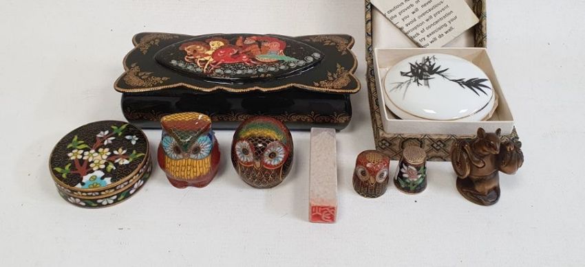Russian paper box featuring St Nicholas in sleigh, bearing cyrillic script and further Asian items to include modern cloisonne, etc (1 tray)